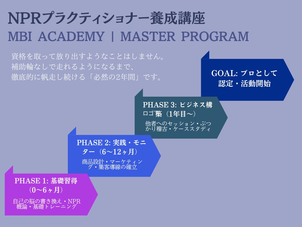 | 価 格 | まずはMBIビジネス講座を受講 ¥440,000(税込) | MBIビジネス講座から 本講座を受講 残りの¥440,000 (税込)でNPRの受講可能! |